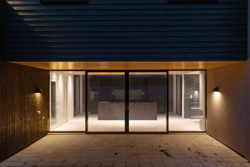 En enebolig med en fasade som gjenspeiler den unike planløsningen med ulike nivåer og soner. Andre etasje har en egen oppholdsavdeling samt en separat fløy med soverom og bad, som skaper funksjonelle og private rom.