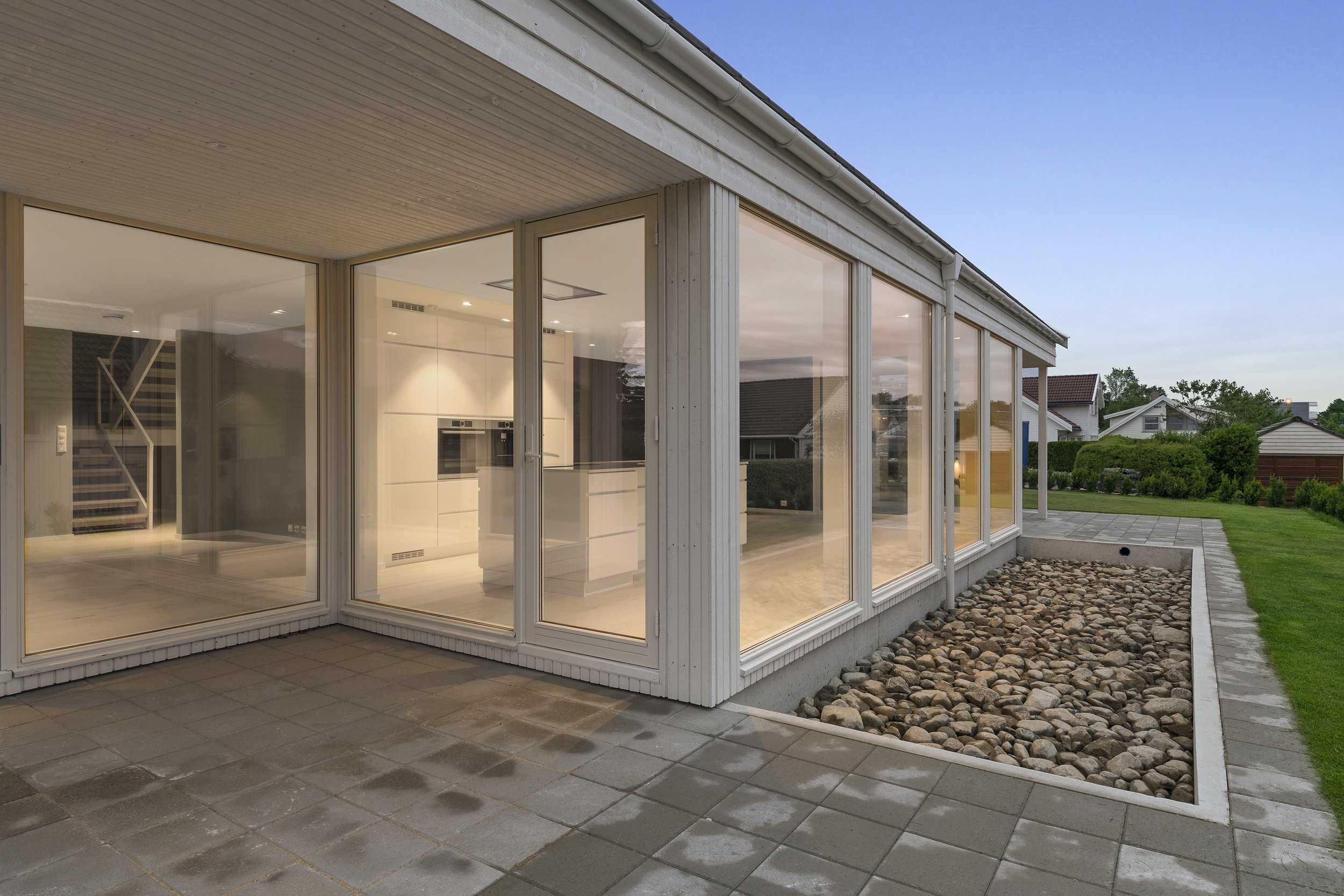 En romslig villa med store vinduer som skaper lys og god kontakt med hage og gate. Innholdsrik planløsning, takterrasse i 2. etasje for privatliv, og takvann som samles i et vannspeil for naturlig fordrøyning.