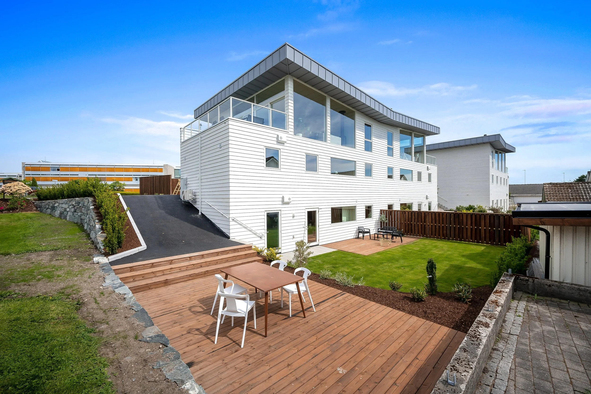 Boligprosjekt på Gosen i Stavanger, bestående av enebolig og tomannsbolig i bakre rekke.