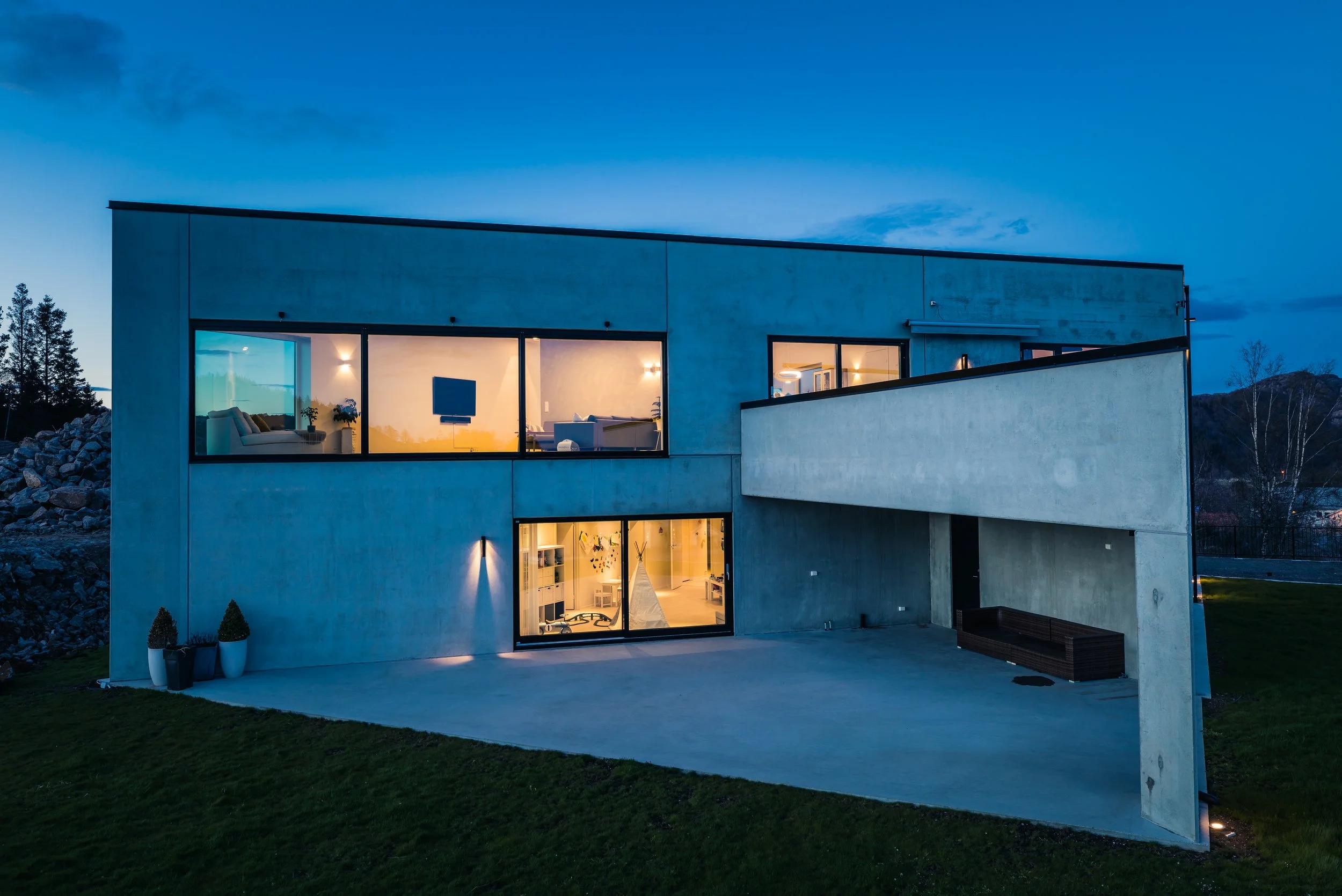 Boligen er oppført med betongelementer som gir struktur og tyngde til uttrykket, både utvendig og innvendig. Planløsningen er organisert med enkle og funksjonelle rom, med vekt på varige løsninger.